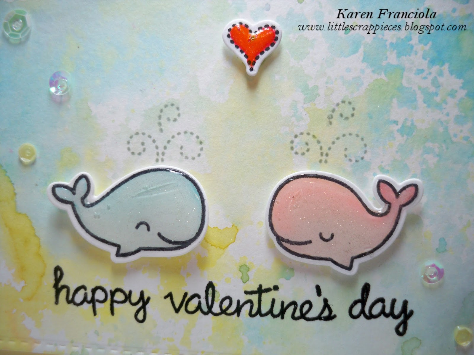 Aaaw, what a CUTE card! The background looks awesome! Beautiful colors to:) The whales are so adorable Karen!